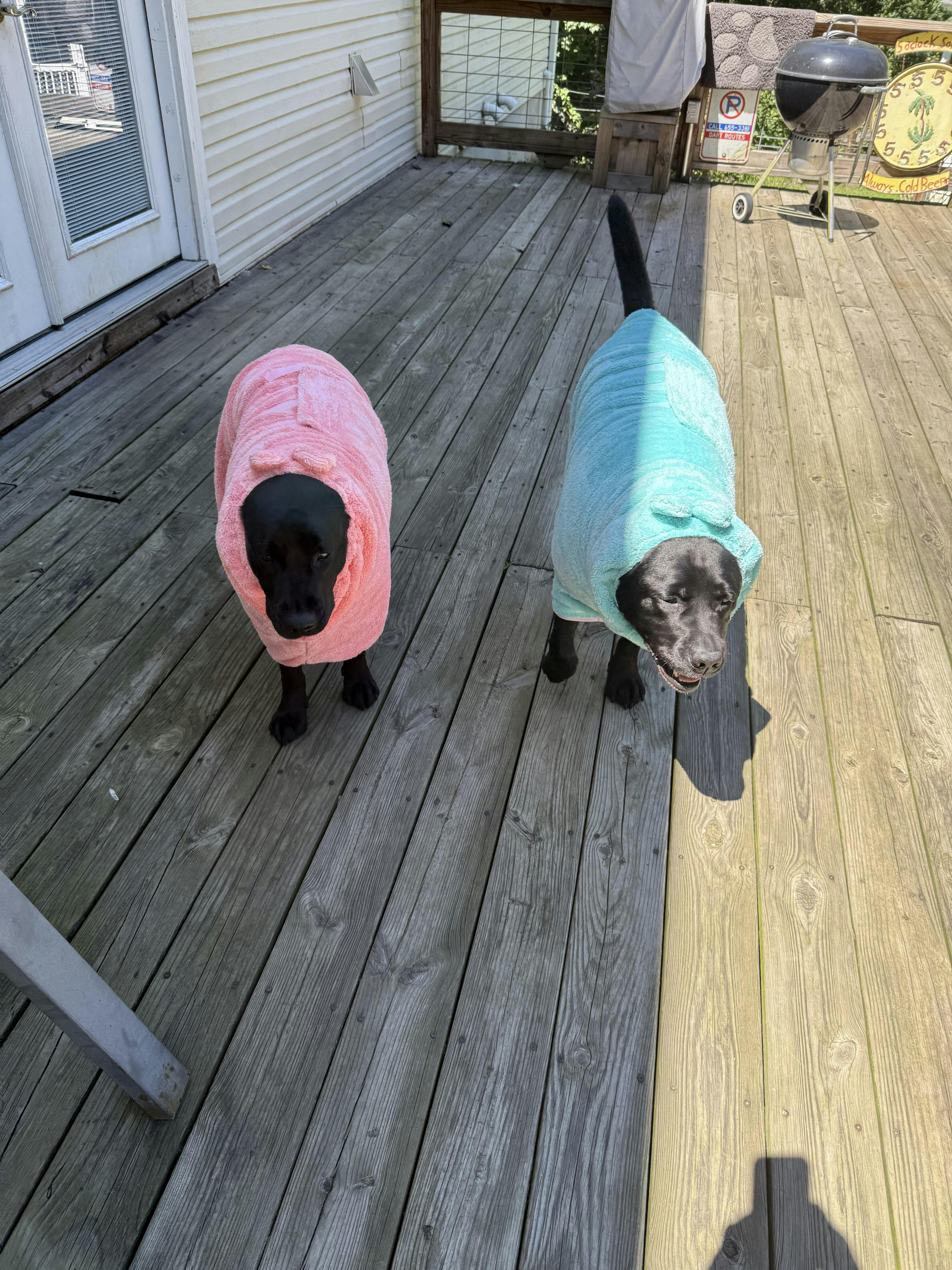 I bought these for gifts because not only are they cute but works great! We have bought several for our dogs since the small one is only 13# (small) and big sis is 63# (large as she’s a big chested English lab) . It’s very absorbent and will stay in place even when they shake! I always bring these with us to the beach as it’ll keep them (and my car) dry. Very easy to put on as the head opening has elastic and the rest of it drapes over the back and secures with strong Velcro. You won’t be disappointed!